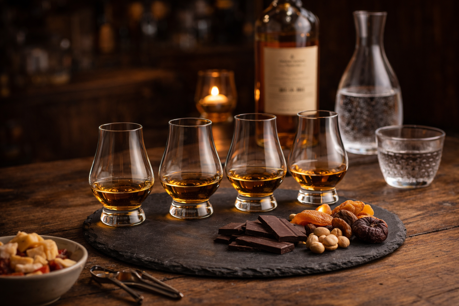 Kulinarische Begleitung: Kleine Snacks wie dunkle Schokolade, Nüsse oder Wasser zur Neutralisierung der Sinne.
